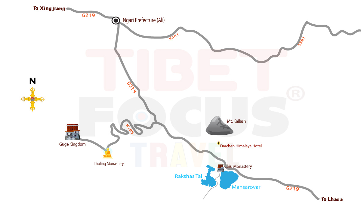 Ngari (Western Tibet) refers primarily to Mount Kailash’s area, including the holy lake Mansarovar, Rakshas Tal, Ali, Purang, Tholing, and the ruined city Tseparang (The Guge Kingdom).Â