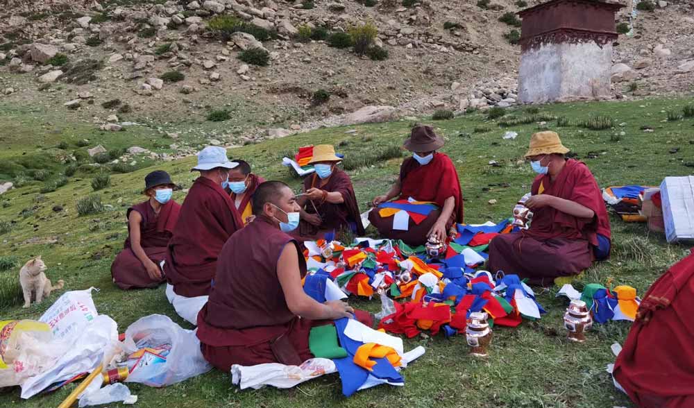 The mountain behind Menri is like a drawn curtain of white silk. In the middle of it, there is an expansive flat rock slab with the naturally formed figures of 1000 Buddhas, 80 Vidyadharas (Rig-Zin, holders of pure awareness), and 1000 darkness.